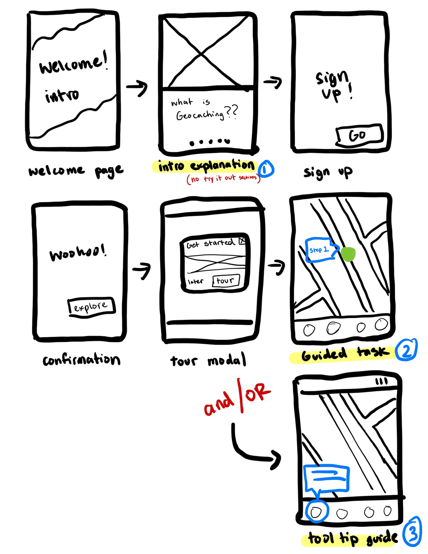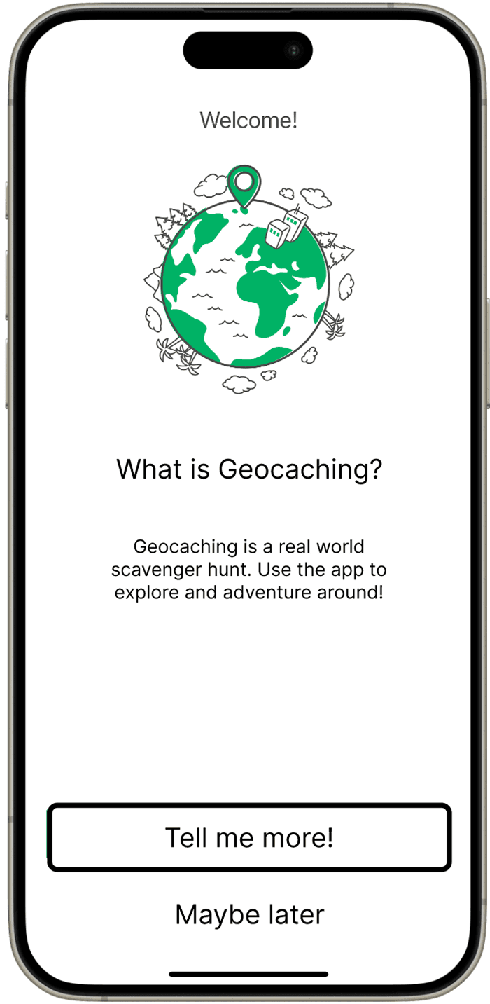 After researching different applications and websites to analyse user flows, I have selected the Geocaching App to refine the onboarding flow and prototype an improved version.