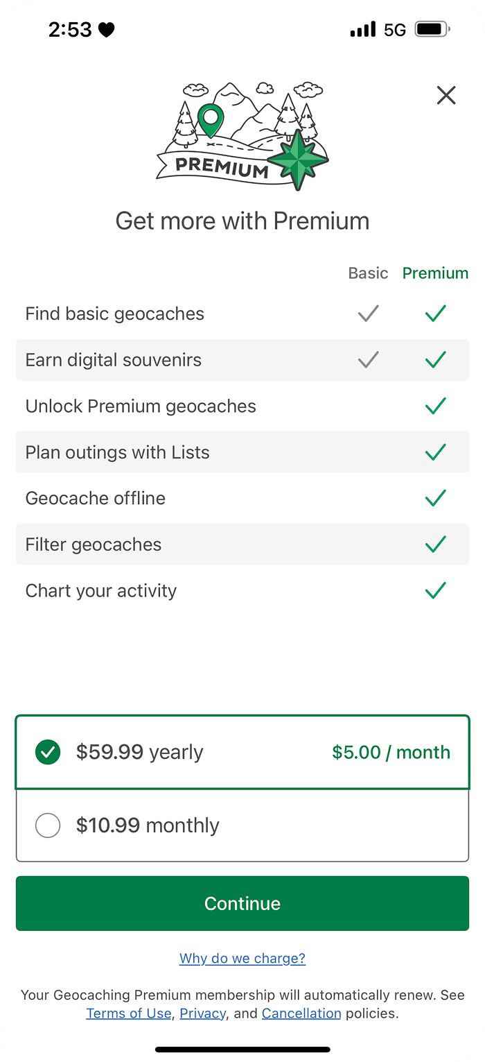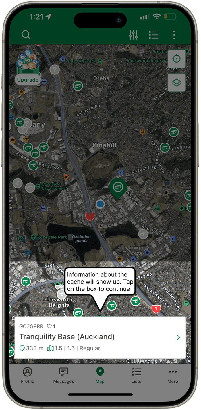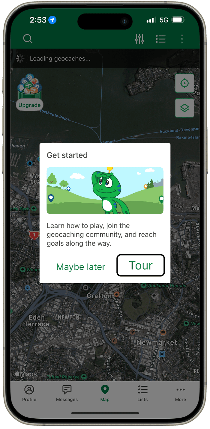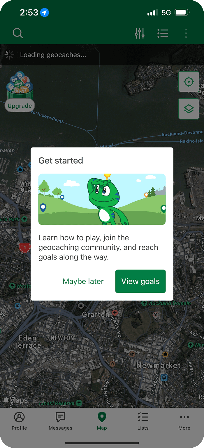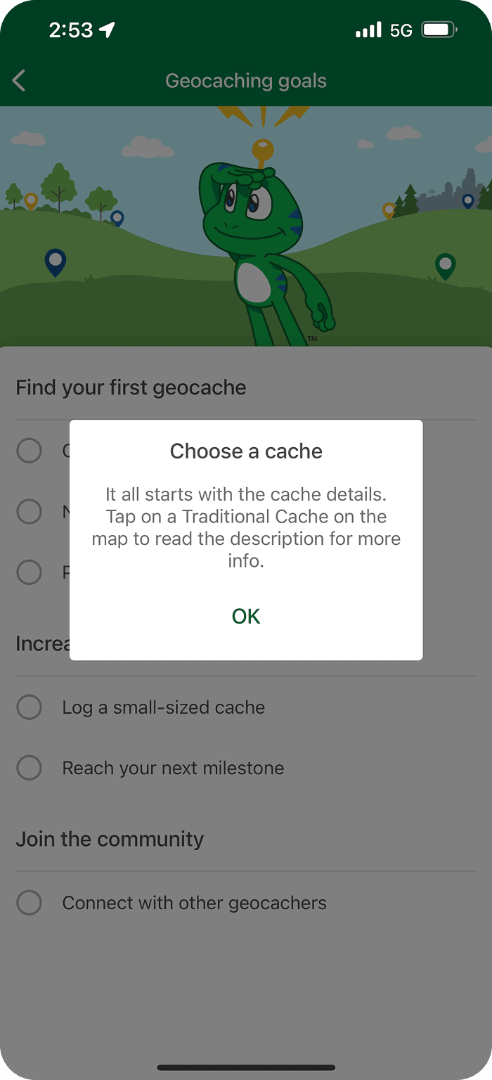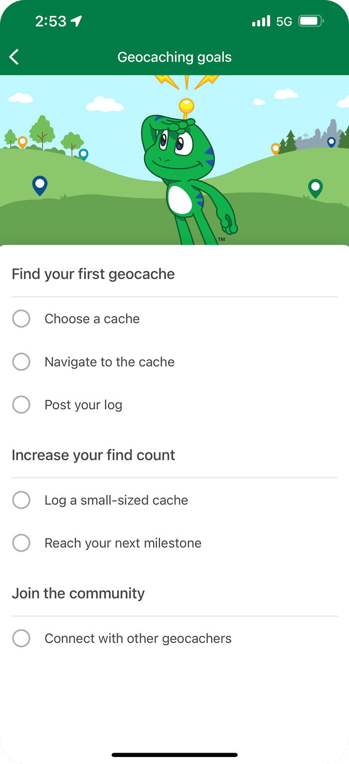 Their attempt at having a “task list” yet, the tasks are quite linear . “Choose a cache”, “navigate to a cache” and “post a log” are vague. There are no connections and no explanations on what steps to take to find a cache. It is not new-user friendly. By the time they have successfully achieved the goal of “finding a cache” by themselves, they may not be considered a “new user” anymore and these onboarding goals popping up randomly could become annoying rather than helpful or encouraging.